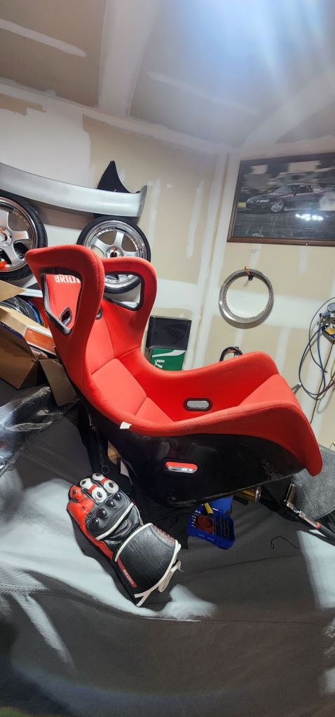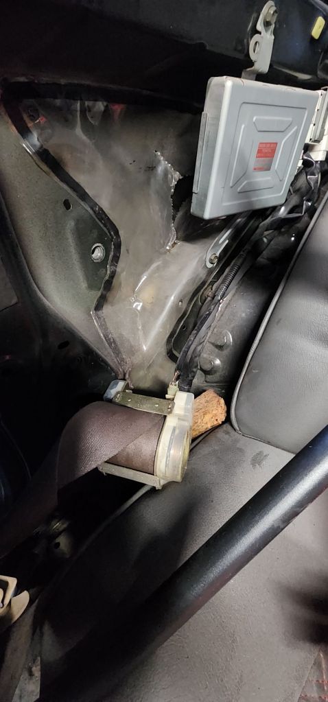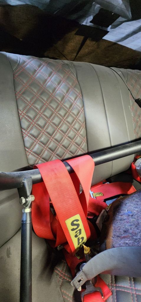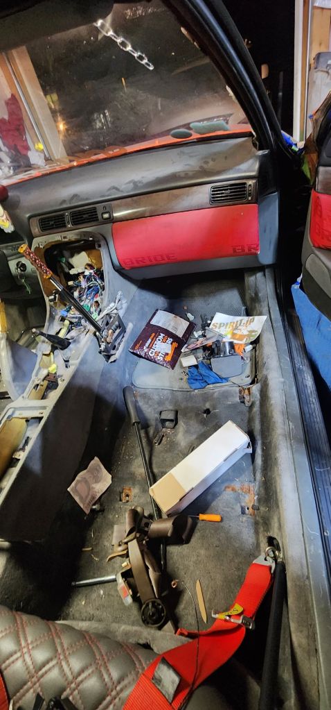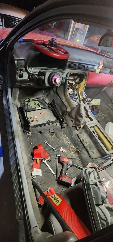 I took a break and started on the interior. I thought this would be motivational but I found quite a few issues. I thought the interior would be mostly dirty but I found that most of the bride material is sun faded as well as dirty. The body shop cracked the front of my seat, they had left the door open while it was in the shop and there’s a thick layer of shop dust and overspray all in the interior, the spot welds to bolt for the harness bar in the B pillar broke and it fell inside, the brackets to the radio broke while pulling it out. I had tried to flock the center console. But the adhesive wasn’t strong enough and the material is all over the interior. I’m going to have to order more cloth and redo all the parts that were already done. Ill also have to get better seat mounts to support the seat after I do some fiberglass repair.