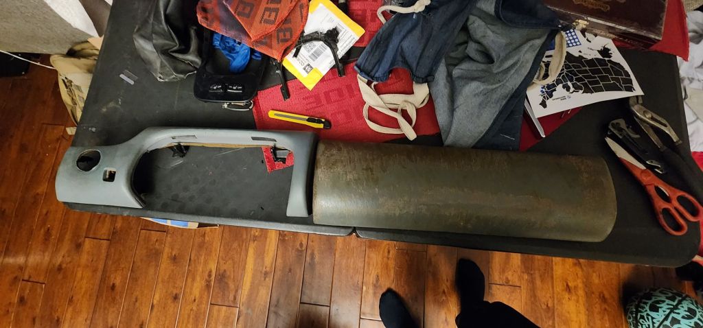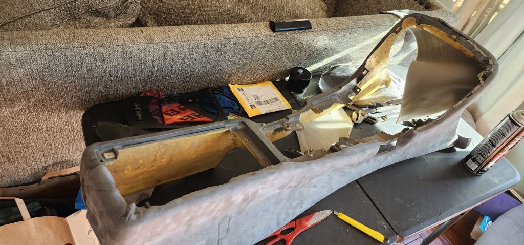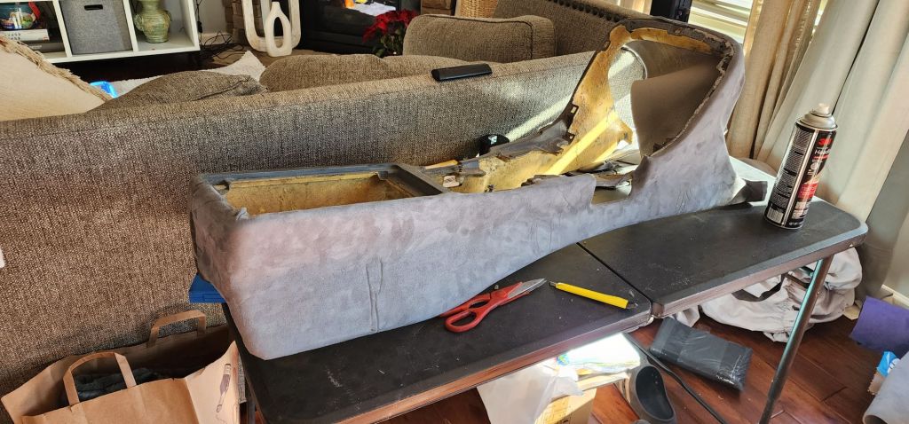 I had flocked the center console grey. But it didn’t come out the way I anticipated and it didn’t stand up to use. So I started to remove the flocking so I can wrap it in the grey suede.