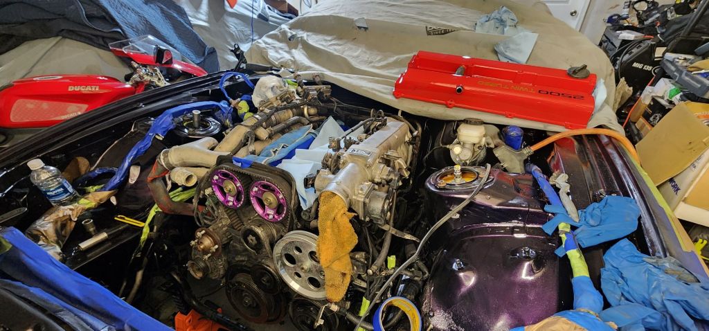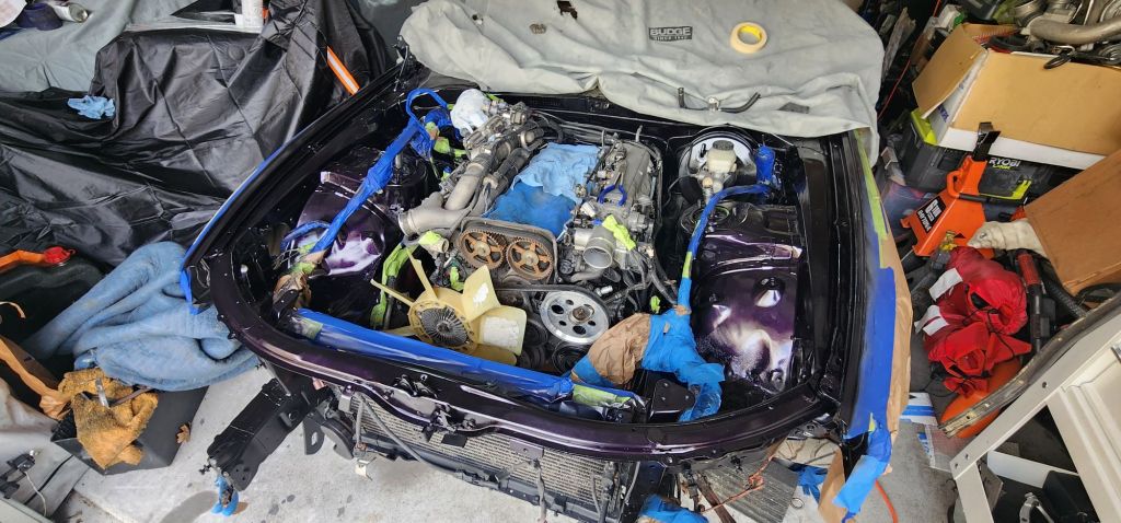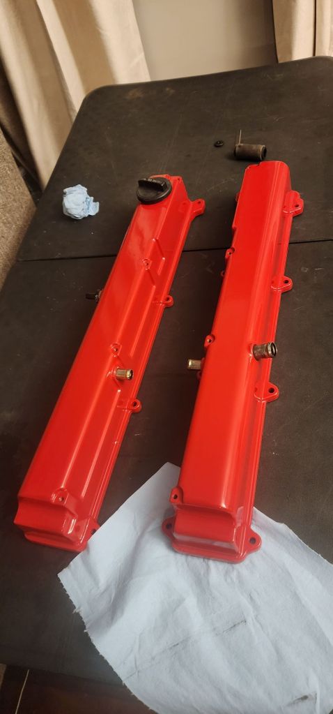 I did a final coat of 2k clear on the engine bay and unmasked the engine to pull the valve covers off for paint.